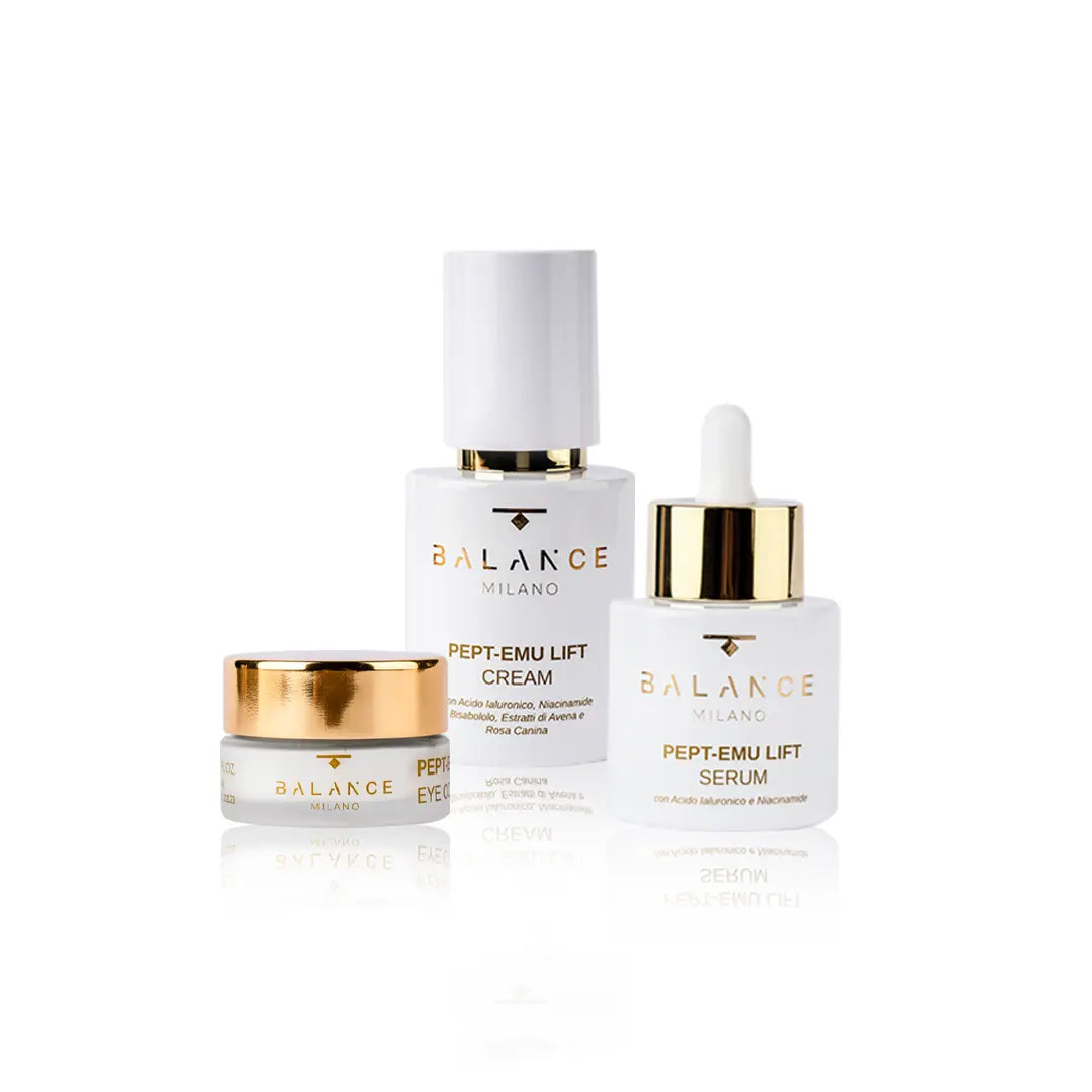 Un vero trattamento di lusso pensato per chi cerca un’azione anti-age globale e specifica per il contorno occhi. Il Pept-Emu Serum e la Pept-Emu Cream agiscono in profondità per ridurre visibilmente le rughe, migliorare l'elasticità e stimolare la produzione di collagene. Ma il vero punto di forza di questo kit è il Pept-Emu Eye, una formula specifica per il contorno occhi che riduce gonfiore, occhiaie e segni di stanchezza, per un aspetto visibilmente più fresco e riposato. Un trattamento completo e di alta qualità che dona luminosità e giovinezza a viso e occhi, combattere i segni del tempo in modo efficace.